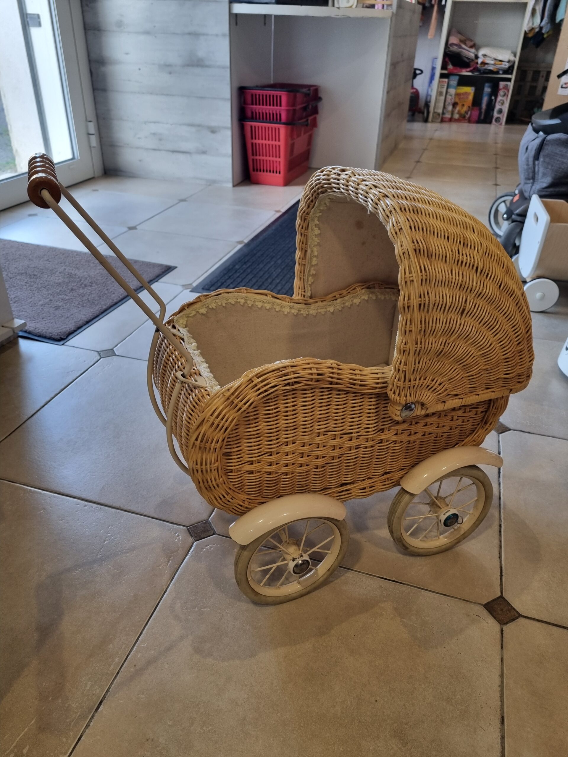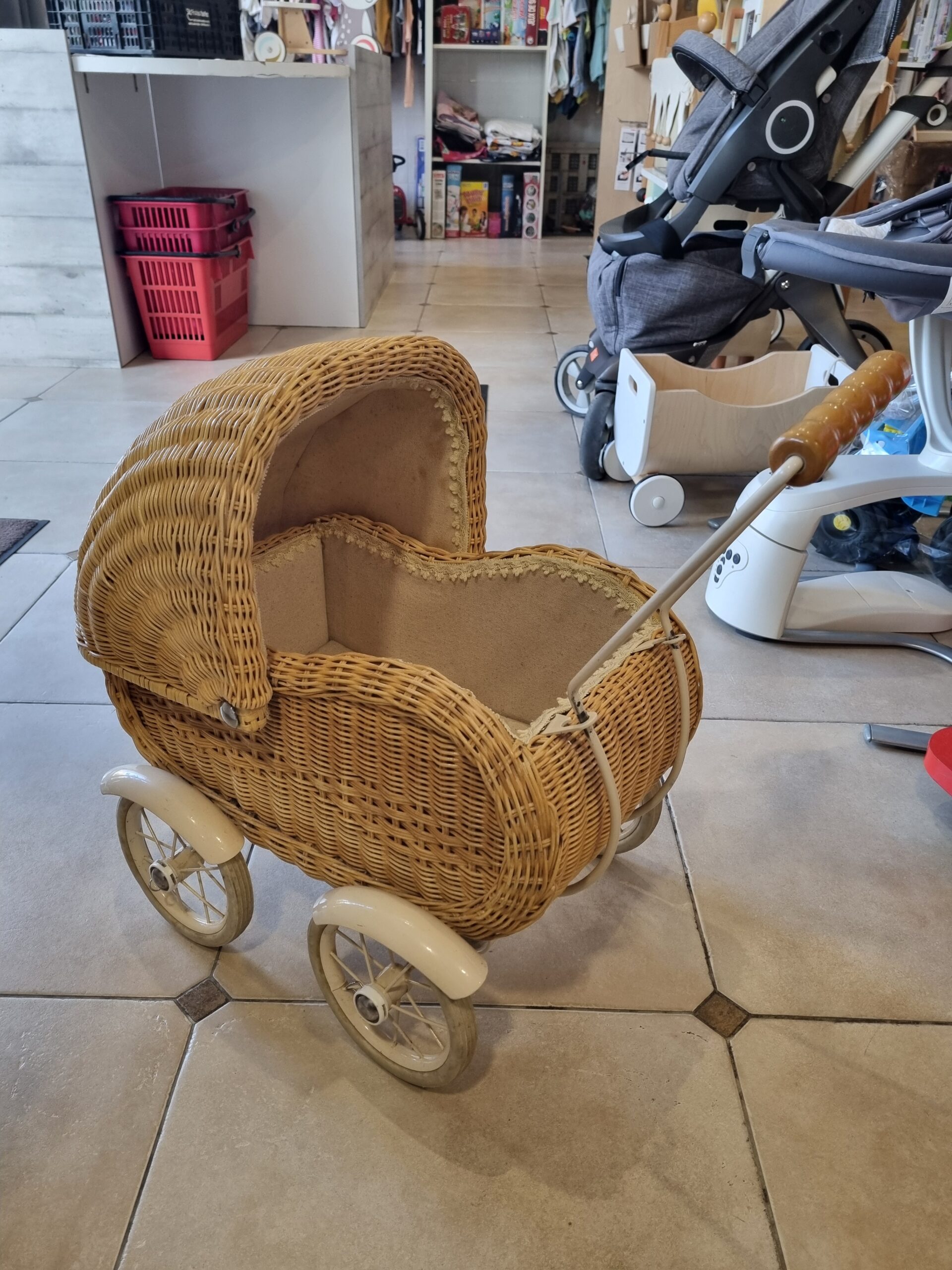 Joli petit landau façon vintage en osier.