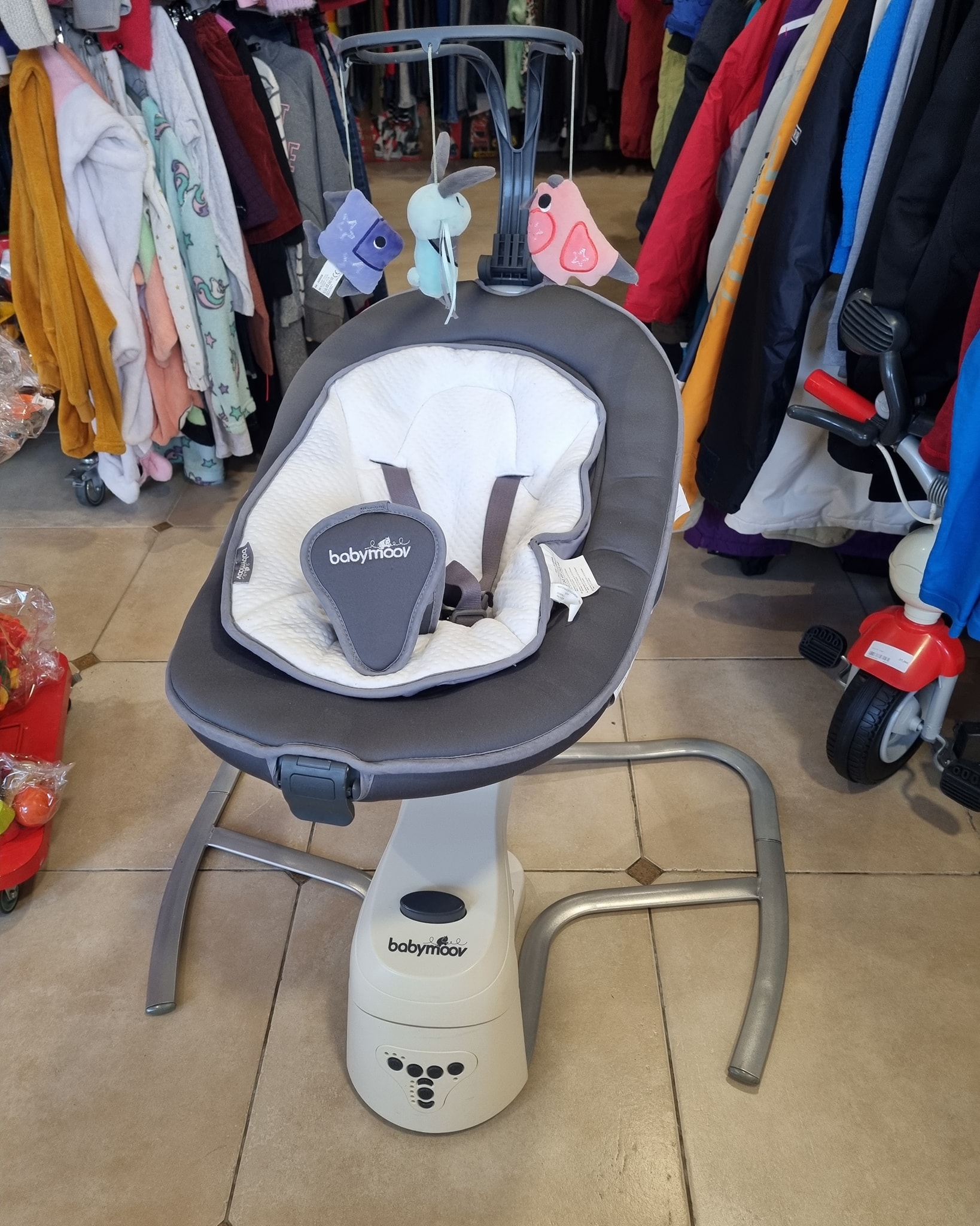 très bon état, plusieurs vitesses de balancement, plusieurs musiques, réglage du volume sonore et adaptateur secteur fourni